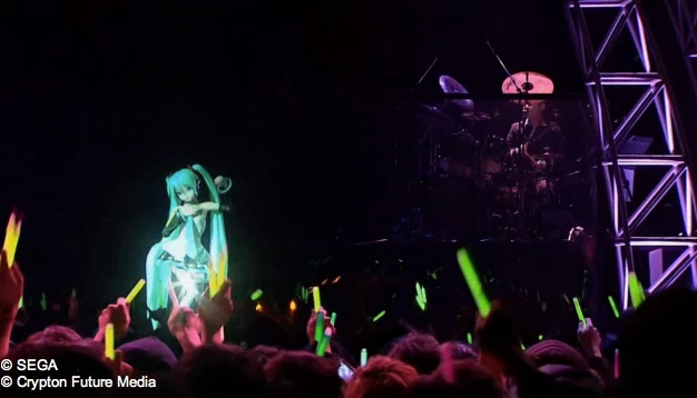 To date (2013) synthetic actors have not performed on a theatre stage to a live audience. Performances such as those of CG character Hatsune Miku (pictured above) are the result of pre-recorded sequences using human performance motion capture back-projected onto a near-transparent stage screen. Miku's synthetic voice is also pre-recorded but the MIDI software that produces her voice, Yamaha's Vocaloid, could potentially be used as the basis for a live-action synthetic actor's song performance. See Live Party 2013 in Kansai (concert in Japanese).